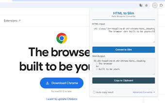 HTML to Slim Converter is a Chrome extension designed for developers who need to transform HTML or ERB templates into Slim syntax easily. This tool allows users to convert any HTML element on a page with a simple right-click or by using an Alt-click for instantaneous conversion, complete with a visual preview. Additionally, users can manually paste HTML into the popup for conversion, with an automatic clipboard copy feature for efficiency. The extension operates offline with a basic fallback for conversions, ensuring accessibility even without an internet connection.